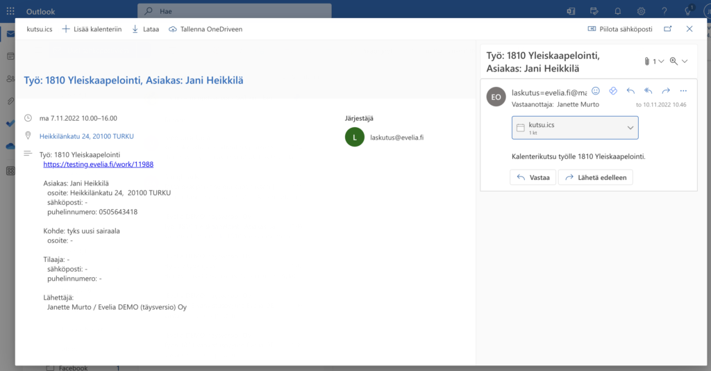 - Kun kalenteritapahtuma on luotu ja sille on kohdistettu työntekijä, lähettää Evelia automaattisesti tästä sähköpostin ja tiedotteen kyseiselle työntekijälle, joka sisältää aina kalenterikutsun.