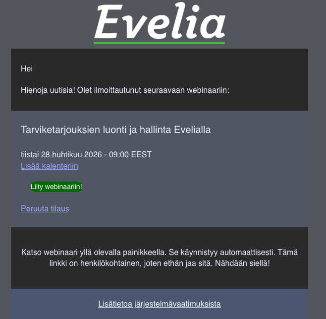 Kun olet ilmoittautunut webinaariin, saat sähköpostiisi linkin, jota klikkaamalla pääset osallistumaan webinaarin livelähetykseen. Pääset osallistumaan webinaariin klikkaamalla linkkiä ”Liity webinaariin!”.