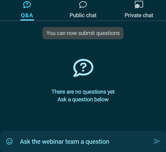 Mikäli haluat esittää meille kysymyksiä webinaarin aikana Q&A-välilehdeltä, joka näkyy videon oikealla puolella olevassa sivupalkissa.